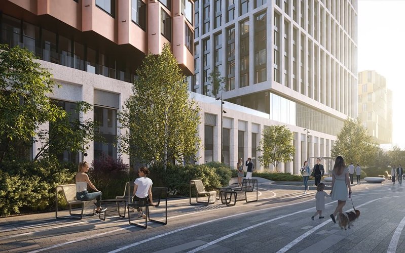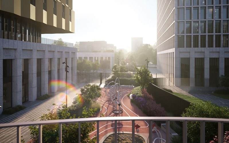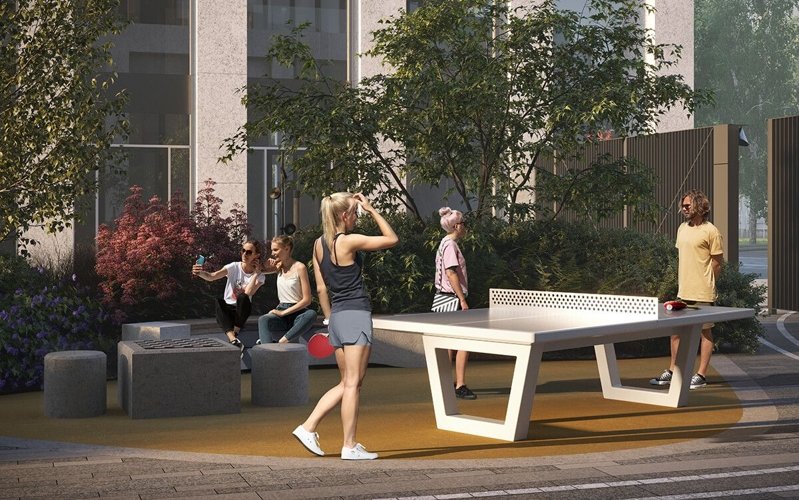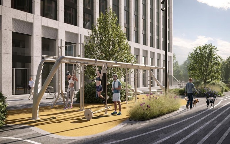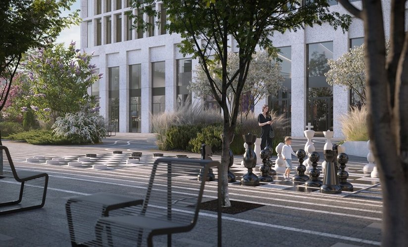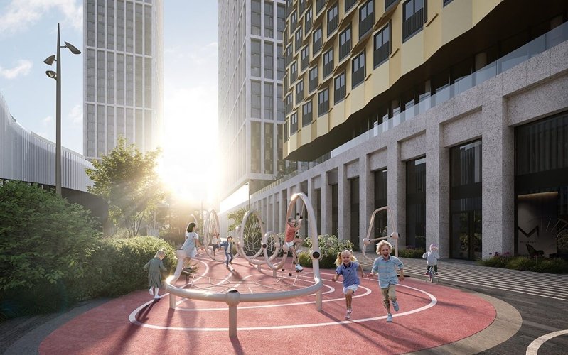 Двухуровневое благоустройство (второй уровень – стилобат) с парящим мостом, детскими и спортивными площадками, зонами для отдыха и общения и центральной площадью, разработанное архитектурным бюро Kleinewelt Architekten, является продолжением общей концепции комплекса.