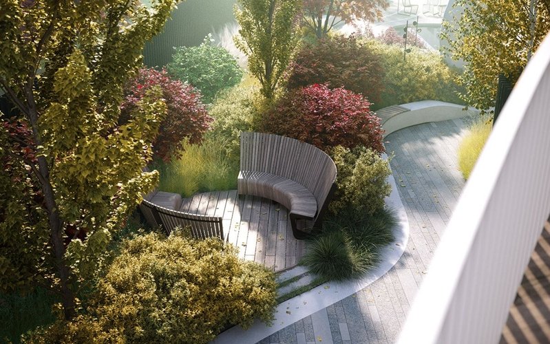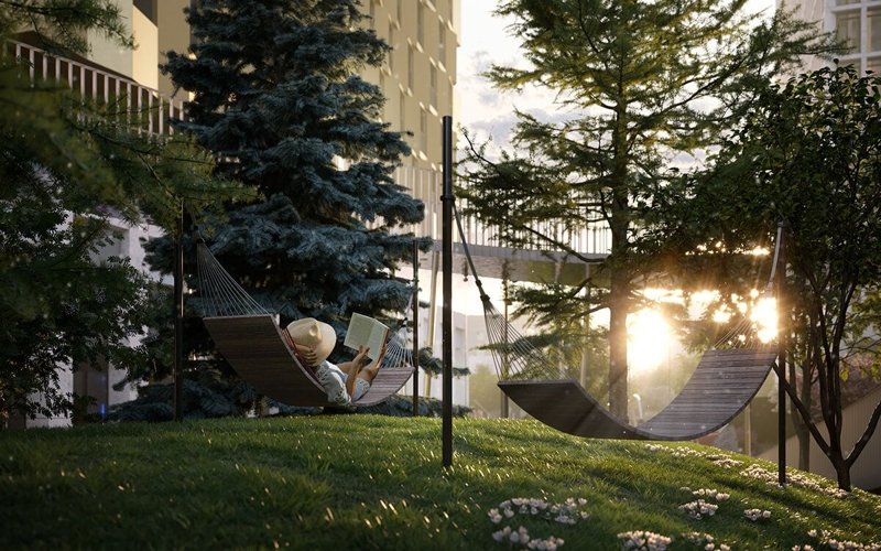 Ландшафтное озеленение с вечнозелёными кустарниками и деревьями создают тихие и уютные зоны отдыха в тени и на солнце, а также пространства для работы и общения. Также для уюта на территории расположены 3 искусственных водоёма с подсветкой.