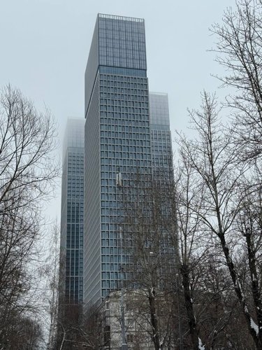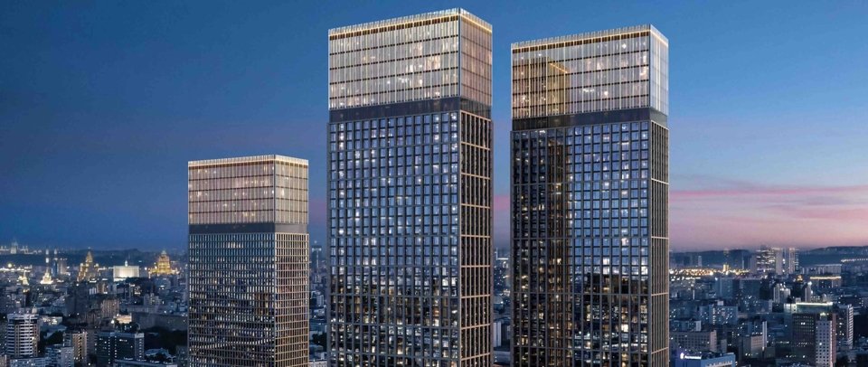 Силуэты трех монолитных башен увенчаны светящейся янтарной «короной». На контрасте со строгими пропорциями башен, над стилобатом, как драгоценные камни, парят три невысоких объема с медным, золотым и изумрудным фасадами сложной формы.