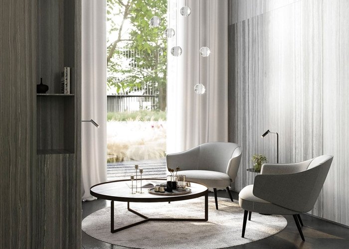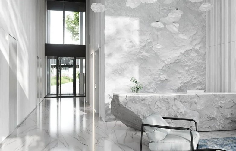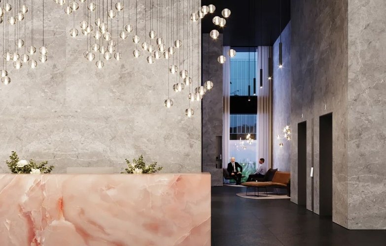 Натуральный камень с фасадов башен переходит в благоустройство, мощение двора и в интерьер лобби.