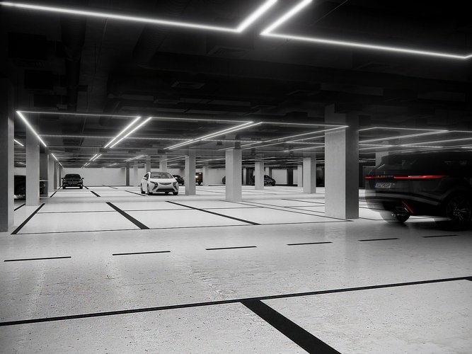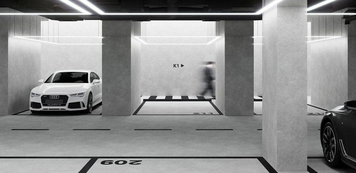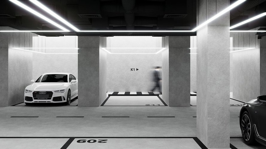 Двухуровневый подземный паркинг на 736 стандартных и увеличенных машиномест, а также машиномест для МГН и мотомест. Все машиноместа оборудованы зарядками для электромобилей, предусмотрены посты мойки колёс и подкачки шин.
